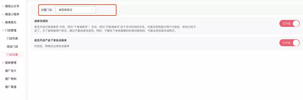 注意事项:门店设置中 “减库存规则”和“是否开启产品下单自动接单”是区分每个门店进行设置的。